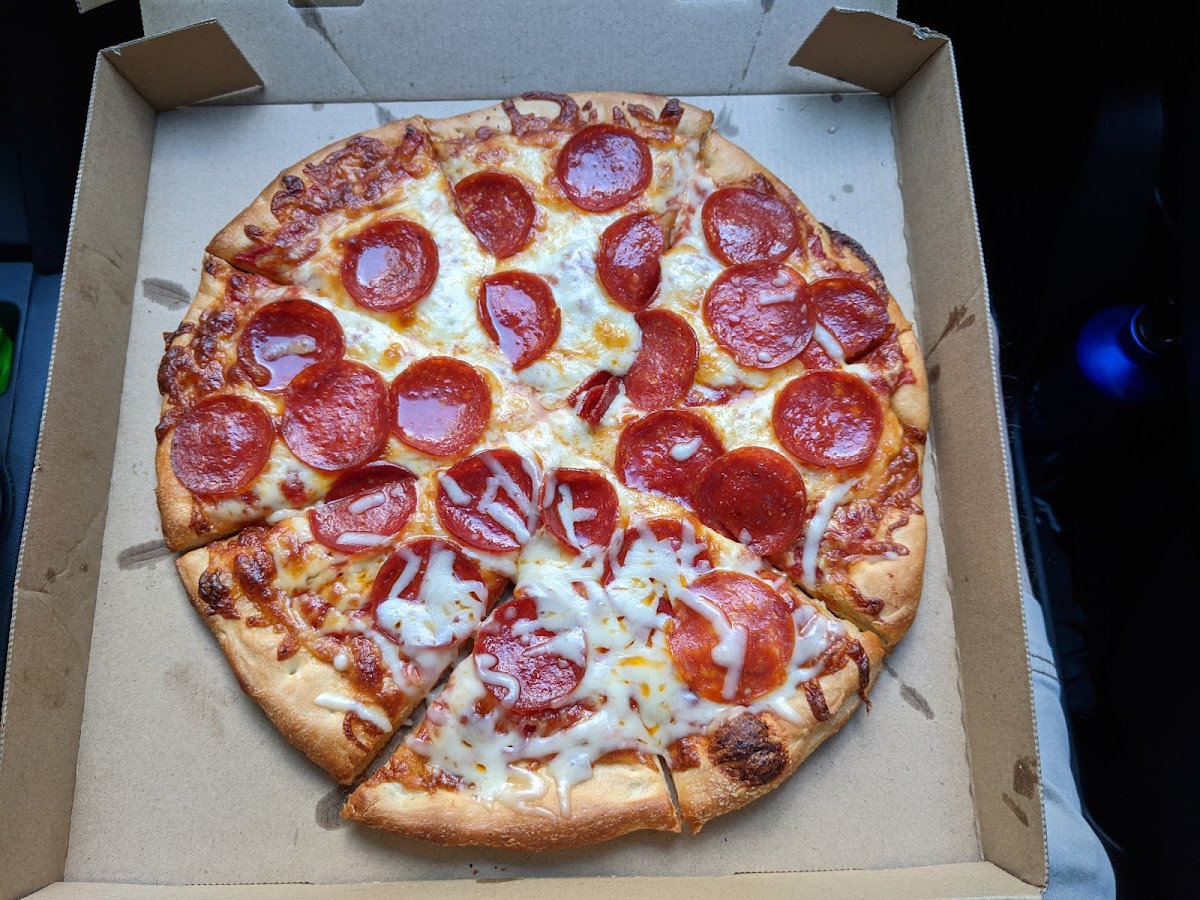 Great little hidden gem! They've been making pizza out of their basement kitchen since the 60's! Yes, it's a pizza shop in a house! A 13" pizza is what they sell, and 6 toppings to choose from for $8, no matter what you get on it. The crust is a little dense and chewy, but delicious. The sauce a little sweet, and it goes great with the pepperoni. I get double pep. Sweet and a little spicy. Great quality cheese an sauce. Addictive pizza imo. A must try for pizza lovers. Great people and great pizza.